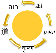 The ONE GOD Book Seal at the top of this page contains the revealed Being Names from the five, chronologically ordered, texts of the ONE GOD Book written on the seal in the modern alphabet of the language in which the Names were first spoken on earth. From top-left, counterclockwise, the English transcription of the Names follows: Yahweh, Tao, Krishna, Jesus, and Allah. The cyclical, counter-clockwise spinning arrows indicate timelessness. At the center of the seal is a simple depiction of the sun. The sun is NOT the ONE GOD; however, the sun is the energy source within the sensory perception of all humans that has some quantum mechanical properties of the ONE GOD. Unlike the revealed Beings, which are earthly manifestations of the ONE GOD, the ONE GOD is outside the space-time continuum and cognitively incomprehensible to the human brain. Although the ONE GOD has neither "form" nor "mode," the ONE GOD is accessible to human experience through the longstanding contemplative traditions of Judaism, Taoism, Vaishnava Hinduism, Christianity, and Islam.